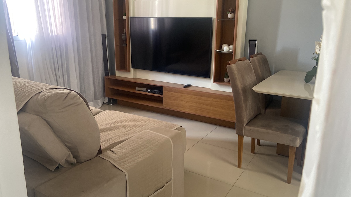 Localização estratégica: a 5 minutos do polo petroquímico de Camaçari, 25 minutos do aeroporto por via expressa e 15 minutos do litoral norte. Acesso a pé a hipermercado e shopping center. Estacionamento interno gratuito. Totalmente equipado: 4 camas solteiro, ar condicionado nos dois quartos, Smart TV, cozinha super equipada, maquina de lavar. Fechadura eletrônica. Check-in/checkout prático e cômodo, sem necessidade de chaves. Wi-fi fibra e mesa para atividades na sala.