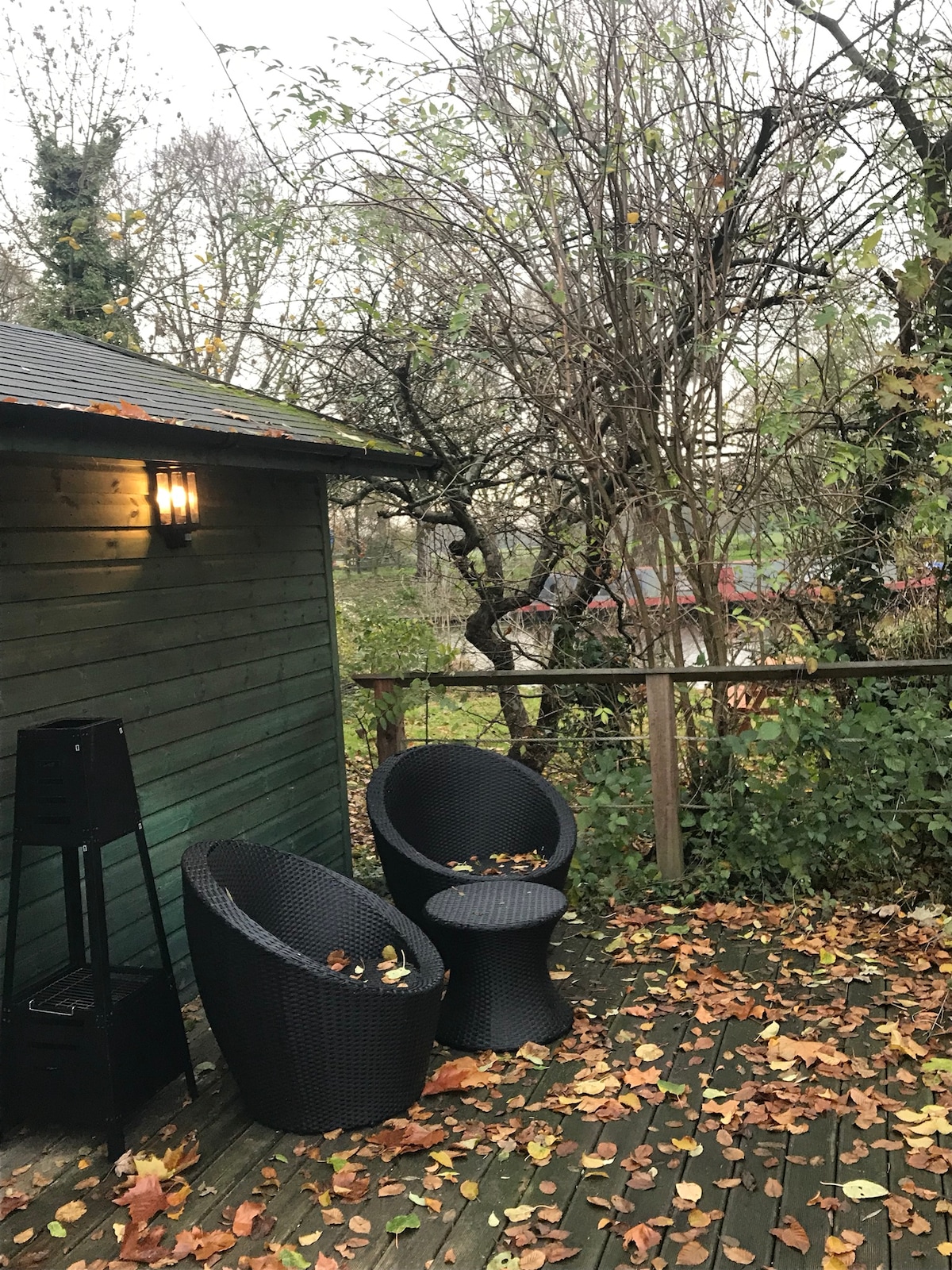 Cam Cottage Cabin is right on the river and is accessed through courtyard gates. It is secluded and an isolated spot nestled in an acre and a half of grounds. It has a private balcony overlooking the River Cam where you can observe rowers, swans and herons gliding by. It is a 20-25 minute stroll along the river towpath into the historic centre of Cambridge or a ten minute bike ride. A Tesco local is 2 mins away, pizza pub and coffee bar and post office. Friendly Labradors roam freely.