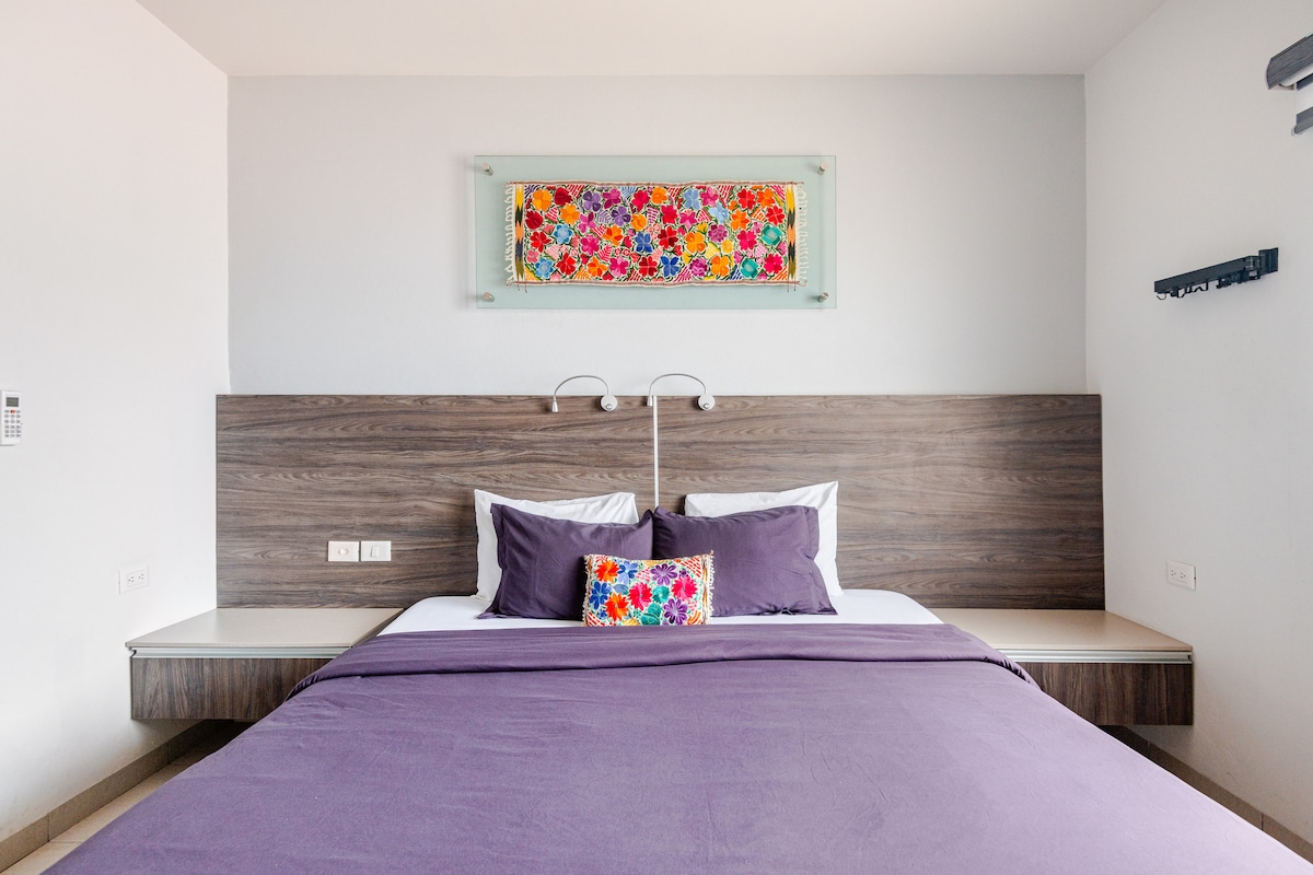 Cama tamaño king, 2 baños en el distrito hotelero, vistas desde la azotea
