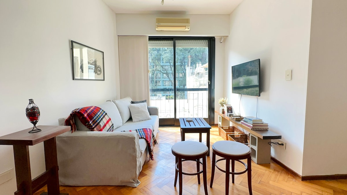 Es un departamento elegante, amplio (60 m2) y luminoso en un antiguo edificio de Recoleta, con una excelente ubicación para vivir una experiencia porteña con espacios verdes, rodeado de museos y restaurantes. Está muy bien decorado, lo que lo ha llevado a ser publicado en revistas de decoración relevantes. Tiene un pequeño balcón que mira a una plaza pequeña (Plaza del Lector II). La Biblioteca Nacional esta a media cuadra en diagonal.