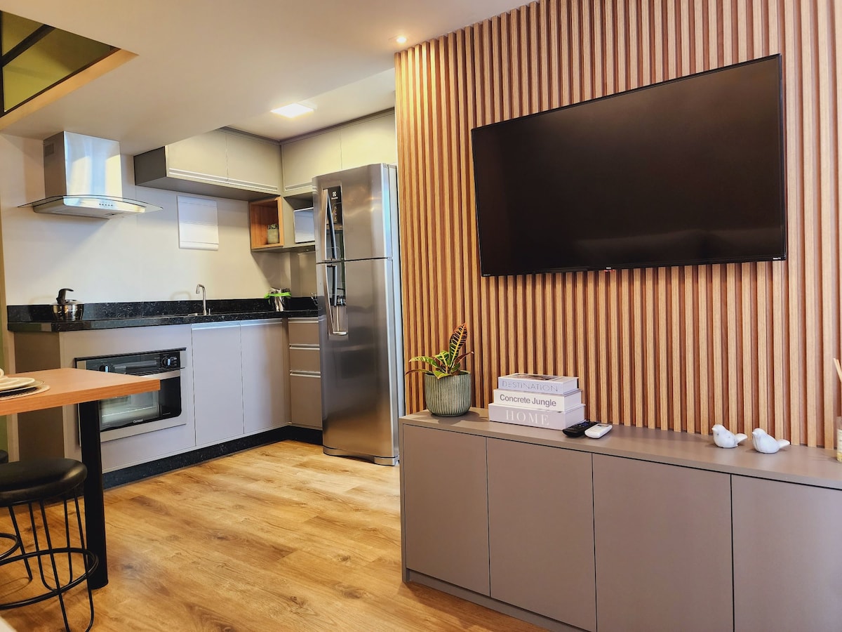 Estudio moderno, nuevo, acogedor, ubicación perfecta, con una hermosa vista desde el balcón, especialmente por la noche. Wifi rápido, escritorio, TV inteligente de 55”, cama Queen. Aire acondicionado (frío/calor). Lavadora y secadora y una hermosa isla en la cocina. 50m2 de mucho estilo-27ºandar, Silencioso. En el Centro/Batel, cerca de comercios, bancos, centros comerciales, polo gastronómico y Hospital. En el edificio: piscina, gimnasio, sala de juegos, sauna, jacuzzi, conserjería las 24 horas.