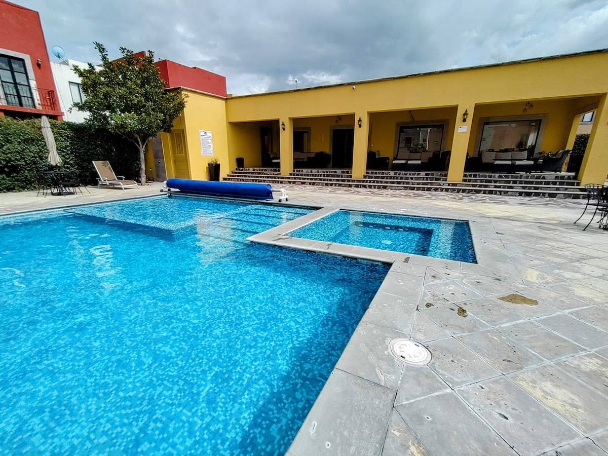 Hermoso alojamiento, con todas las comodidades para que te sientas como en tu propia casa, totalmente equipada, bien iluminada, con una decoración de buen gusto y moderna, amplio roof garden con vista al campo de golf, áreas comunes con alberca, sala de usos múltiples con juegos, jardín y gimnasio. A solo 15 minutos del centro de San Miguel de Allende la mejor ciudad del mundo según Travel & Leisure.