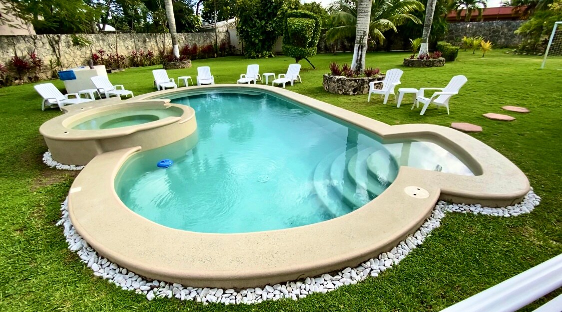 • Piscina privada. • 5 habitaciones espaciosas. • Cocina totalmente equipada. • Internet de alta velocidad (300mb). • Mesa de hockey de aire y PlayStation 5. • Vecindario tranquilo y seguro, con estacionamiento privado para hasta 2 vehículos. Disfruta la alberca, juega hockey o PS5 y relájate en 5 exclusivas suites. Zona residencial tranquila, tiendas y servicios a pasos. Reserva 4+ noches y recibe traslado gratis desde el aeropuerto. Reserva hoy y obtén 15% en tu próxima visita.