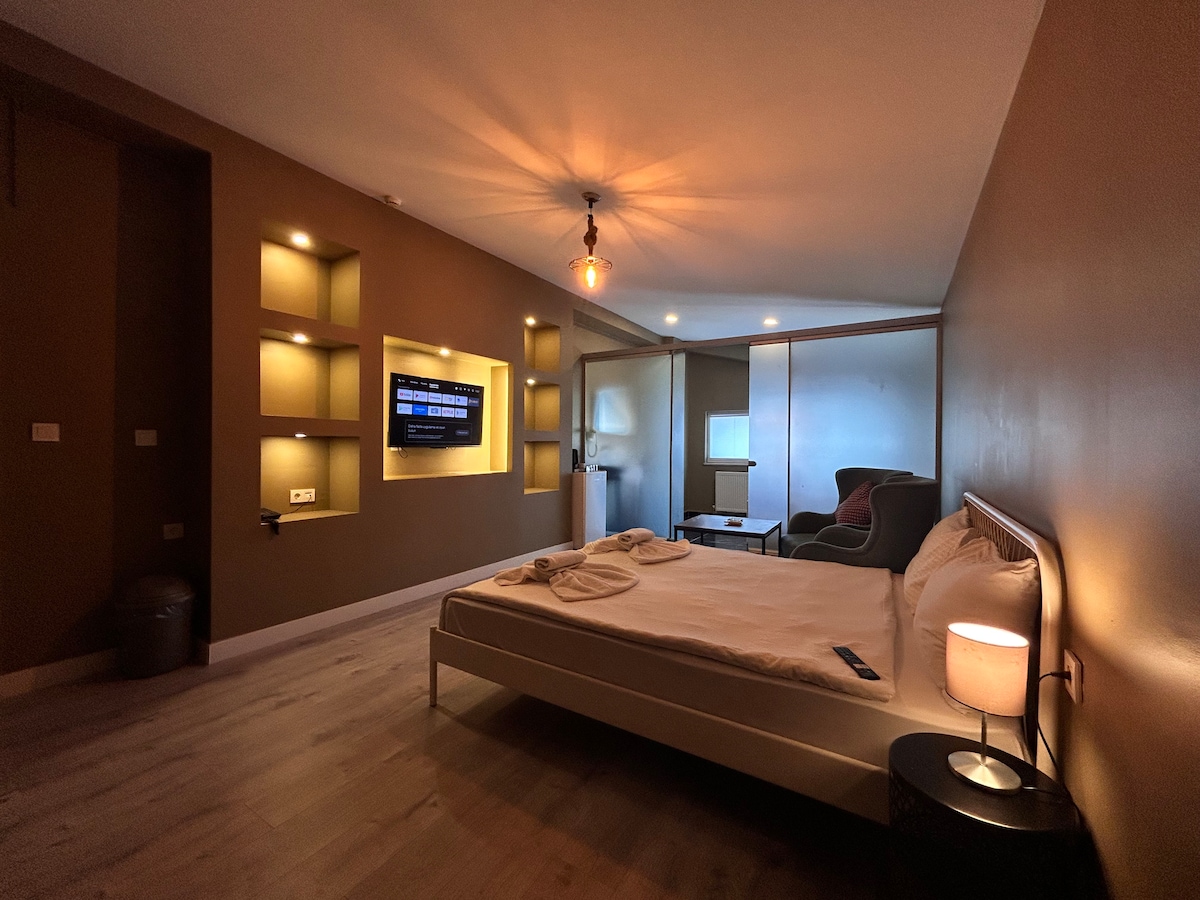 La suite familiar 2+2 dúplex de Aldino Residence & Hotel ofrece una zona de alojamiento grande y cómoda. En la planta baja hay una cama doble, en la planta superior hay 2 camas individuales y 2 amplios sofás cama. Gracias a sus 2 baños, proporciona comodidad para todos los miembros de la familia. Estamos disponibles para satisfacer todas tus necesidades con cocina totalmente equipada, desayuno bufé, limpieza diaria y servicio de recepción las 24 horas, los 7 días de la semana. Con una sala de estar grande y cómoda, puedes relajarte cómodamente e ir a explorar la ciudad.