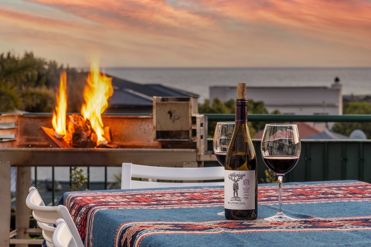 Esta casa de vacaciones frente al mar, bellamente renovada, está situada entre Gansbaai y De Kelders en la región de Overberg, en Cabo Occidental. Con vistas a la bahía Walker, la generosa terraza elevada permite disfrutar de las mejores vistas al mar y de cerca del avistamiento de ballenas de agosto a noviembre de cada año. Hay dos zonas de barbacoa (braai), una en el interior y otra al aire libre en la terraza con vistas al mar. Disfruta de vistas ininterrumpidas al mar desde el salón y despierta con los relajantes sonidos del océano en los dos dormitorios frente al mar.