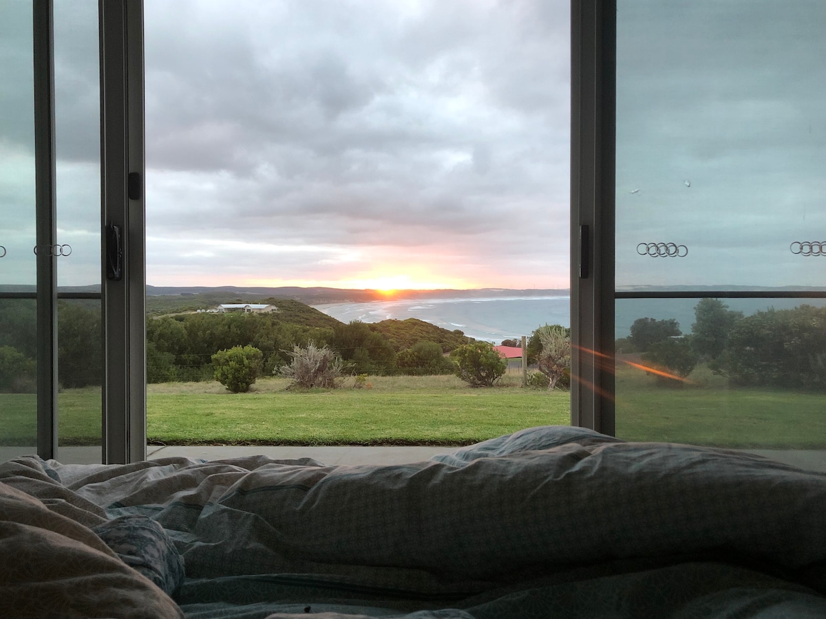 Robeathyn is a spacious 4 bedroom beach house set on a headland with sweeping vistas of Discovery Bay and the Southern Ocean. The house is one of two set on 10 acres of natural bushland and nearby access to the Great South West Walk. Ideal in all seasons; you can enjoy the ocean crested sunsets on the expansive patio as you sip on a wine or two, alternatively you can snuggle in around the fire and enjoy the same amazing view from the lounge area.