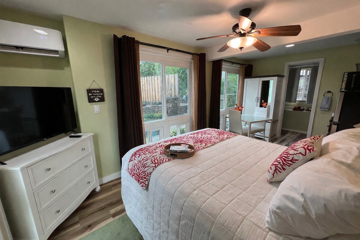 Designed by Twin Islands Interior Design Group - Escape to Big Island and indulge in the tropical paradise of Hawaii with this charming 1 bedroom, 1 bathroom Airbnb property. Enjoy an ocean view from your breezy porch and sleep peacefully in a comfortable queen-size bed. AC unit in apartment, evenings and mornings are cool due to elevation. Spend lazy afternoons on the porch and soak up the jungle energy. Experience the magic of Big Island Kealakekua for yourself!