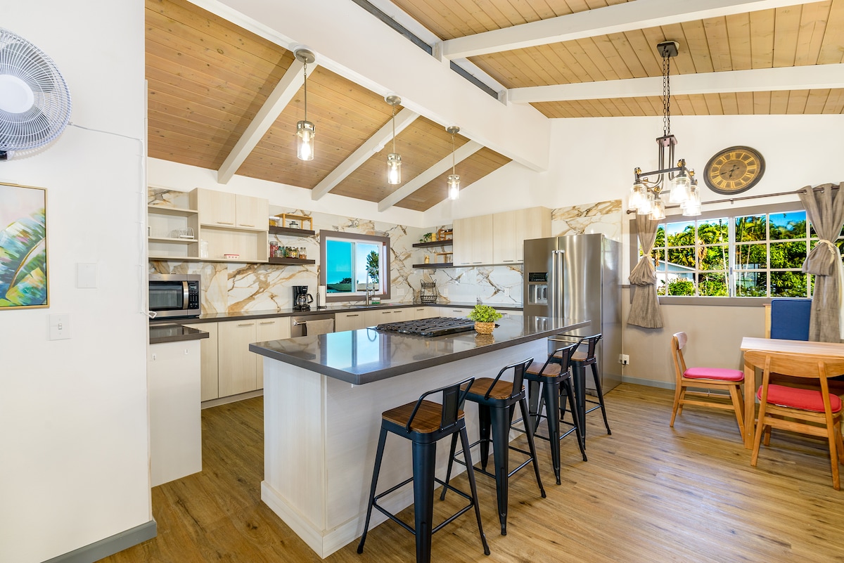 Escapa a nuestra granja de café Kona de 3,5 acres, ideal para familias, enclavada en las montañas a minutos de las playas, a 15 minutos de Kailua-Kona y a 5 minutos de Captain Cook. Los niños pueden alimentar a nuestras amigables gallinas, ver gecos y explorar los exuberantes jardines llenos de cafetos, frutas y flores. La moderna granja de 3 dormitorios y 2 baños incluye un amplio lanai, perfecto para comidas familiares, café por la mañana y contemplar las estrellas. Disfruta de las frescas brisas de la montaña, un escape refrescante del calor costero y la magia del café Kona.