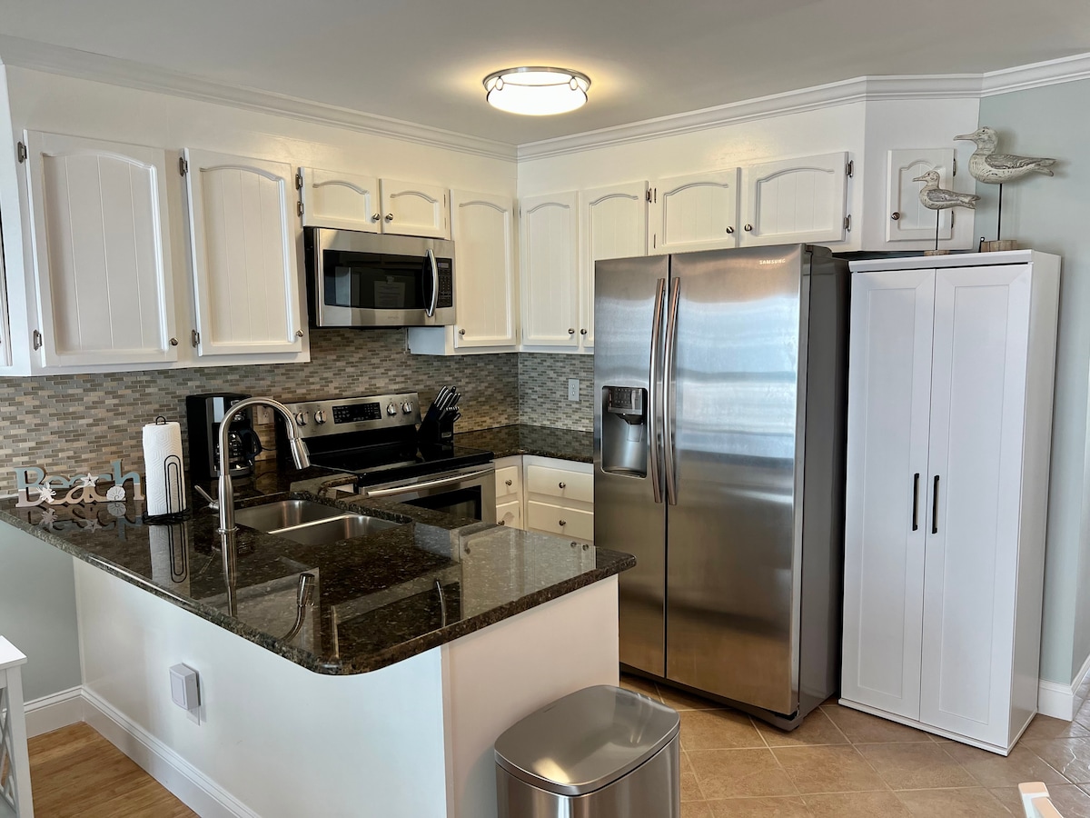 Apartamento remodelado de dos dormitorios, dos baños y frente al mar en Carolina Beach Ave SOUTH. Cada dormitorio tiene una cama tamaño queen, Smart TV, cómoda y baño privado. Capacidad para 6 personas (incluido el sofá cama). Cocina remodelada con encimeras de cuarzo, electrodomésticos de acero inoxidable y totalmente equipada con utensilios de cocina y vajilla nuevos. Lavadora y secadora en la suite. Balcón de 160 pies cuadrados con vistas sin obstáculos al mar y muebles de exterior. Cable, wifi, TV inteligente, piscina privada del condominio y dos plazas de aparcamiento reservadas incluidas.