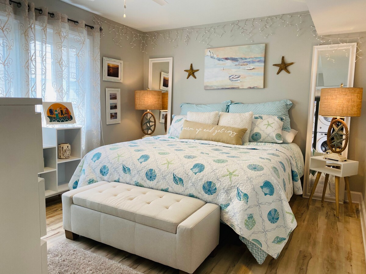 Mi equipo es anfitrión con la mayoría, ¡y queremos que tu estadía sea perfecta! Este espacio es absolutamente perfecto para una pareja y 1 tal vez 2 más cuando sea necesario. Con vistas al mar y al canal en el corazón de Carolina Beach, esta pequeña joya viene con una cocina de servicio completo, una bañera de buen tamaño y una cama tamaño king. El otomano en el salón se convierte en una cómoda cama doble. El acceso a la playa está a solo unos pasos. A 5 minutos a pie del paseo marítimo CB.