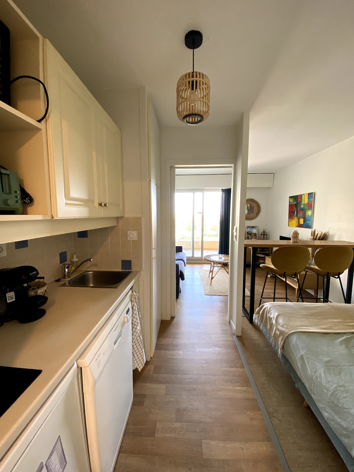 En una residencia tranquila y segura, relájese durante sus comidas tanto en el interior como en el balcón, mientras disfruta de una amplia vista al mar y las colinas. Dado que el estudio ha sido renovado, encontrará todo lo necesario para su comodidad. Desde el aire acondicionado para los días calurosos, hasta la partición extraíble de la habitación dúo. Refrésquese en un baño de mar, con los pies en la arena, al otro lado de la calle o con una copa en la mano en la parte inferior de la residencia. Feliz estadía