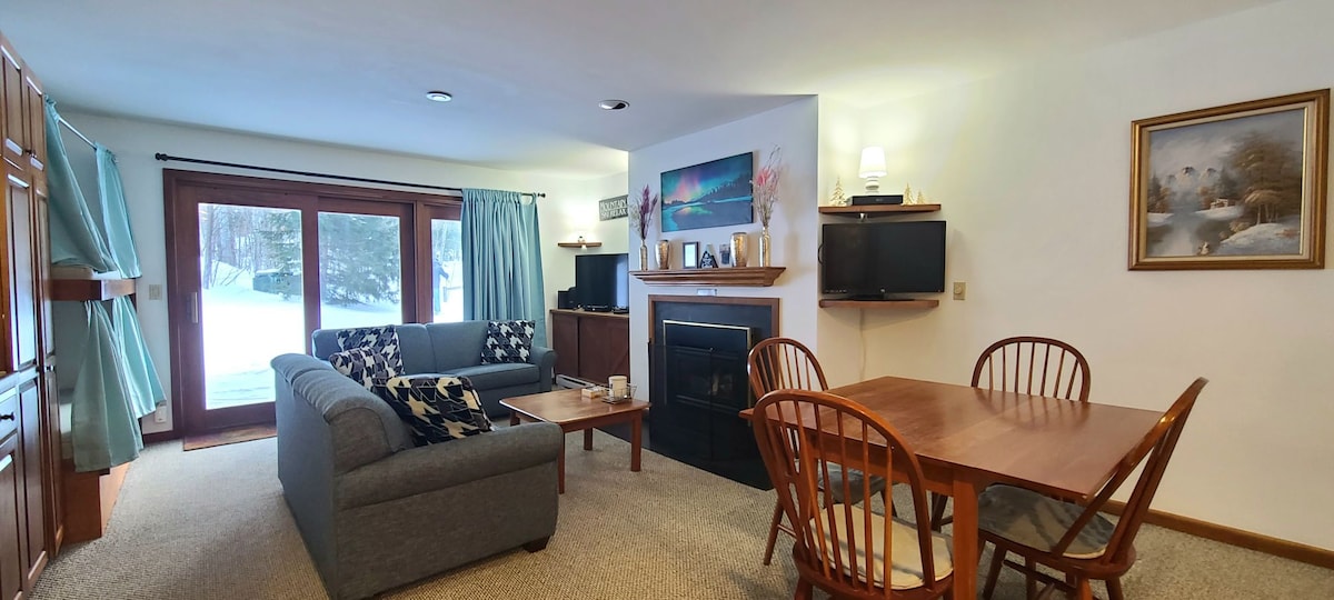 Apartamento PRIVADO y de lujo en el pueblo a poca distancia a pie de restaurantes, piscina, senderos para caminar, alquiler de kayaks y kayak, así como raquetas de nieve y motos de nieve durante el invierno. Alquiler gratuito de patines para patinar en Haley Pond y también puedes alquilar raquetas de nieve y kayaks en Ecopalagicon. Cuando el estanque está congelado, los MOTONIEVE pueden cruzar el estanque Haley, que está frente a mi casa, para llegar a los senderos. Mi entrada tiene capacidad para 2 remolques de motos de nieve. Mínimo 2 noches en FIN DE SEMANA DE SNOWDEO.