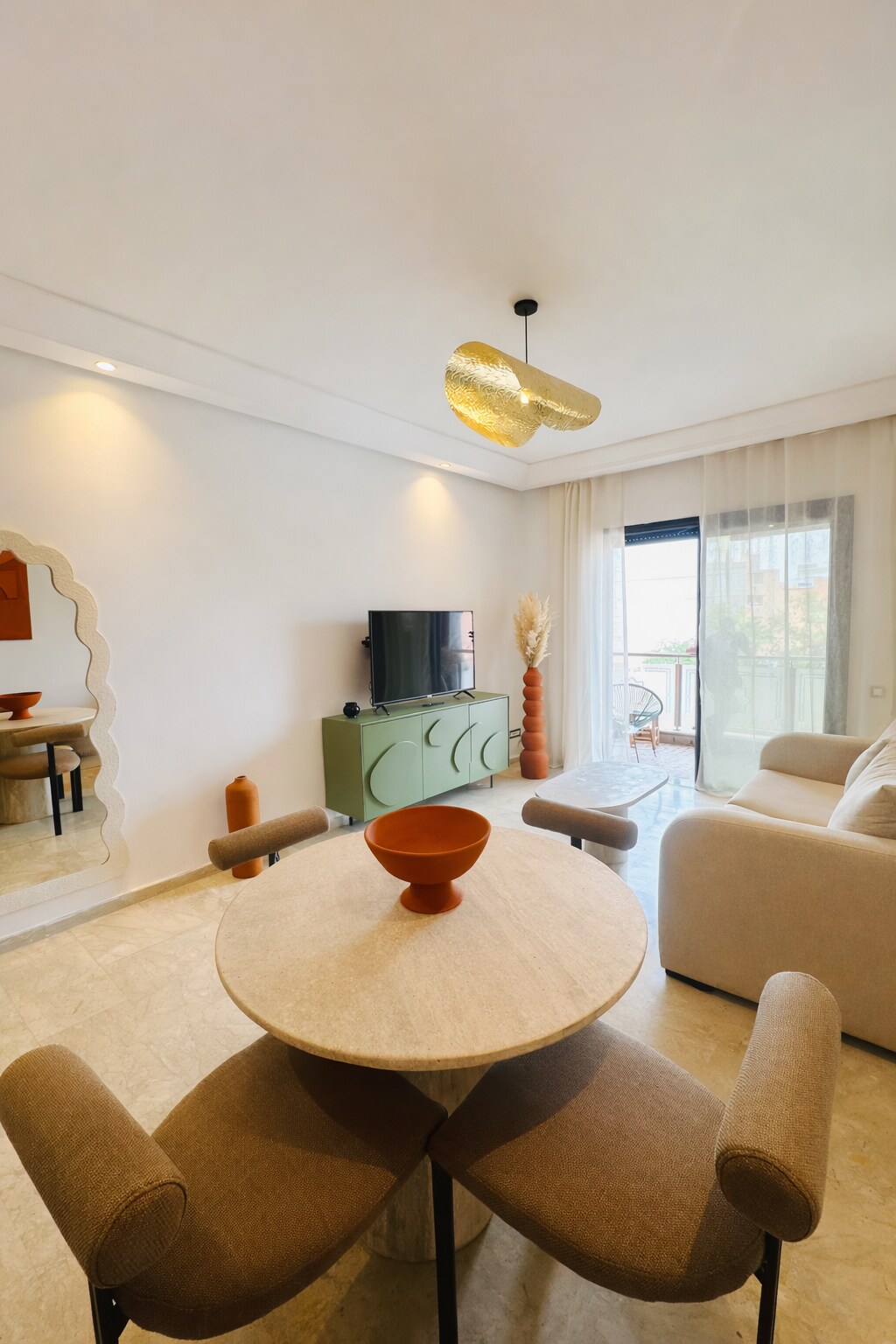 Comfort in the Heart of Marrakech This 60 m² apartment ideally located: 1 minute from Carré Eden 5 minutes from the train station 12 minutes from the airport Perfect for 2 guests! What you'll love: *A queen-size bedroom with a beautifully designed living area *HD TV with IPTV *A fully equipped kitchen *Stable Wifi *Terrace with a beautiful view, a deckchair & a table Whether you're visiting for business or leisure, this apartment offers the perfect base for your stay.