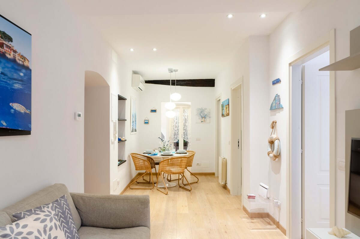 Disfruta de unas vacaciones con estilo en este espacio en el corazón de Sestri Levante. Apartamento ubicado entre la Bahía del Silencio y la Bahía de las Fábulas, en la planta baja de un edificio histórico con entrada independiente que consta de dormitorio doble, sala de estar con cocina americana y sofá cama, baño con ducha espaciosa y aire acondicionado en todas las habitaciones. Equipado con aspiración centralizada y cuna bajo petición. Plaza de aparcamiento privada a pocos pasos (precio a convenir)