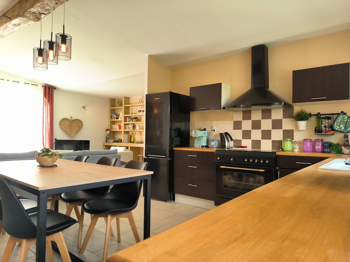Relájese en este alojamiento único y tranquilo. Habitación con cama de 160, baño con ducha italiana , inodoro, cocina con comedor de pie y sillas altas, sillones cabriolet de cuero. Entorno arbolado y florido, piscina en temporada de acuerdo con los propietarios Lugar de estacionamiento en callejón privado Mesa y sillas de exterior Tumbonas Desayuno en el interior o en el jardín según el clima Tv wifi