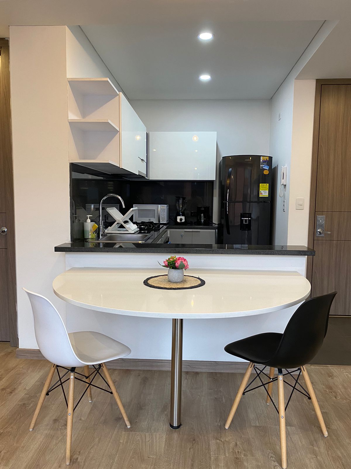 Located in the best area of Bogotá. ideal for business trips, leisure and small families that want to stay in a studio apartment. You will be in walking distance from three main shopping centers, top restaurants, gyms, supermarkets, bars, clubs, parks, coffe shops, hospitals and public trasnport stations in the city. This brand new studio apartament offers 24/7 doorman security a panoramic terrace on the building´s top floor, jacuzzi and front view to one of Bogota´s principal parks, el Virrey