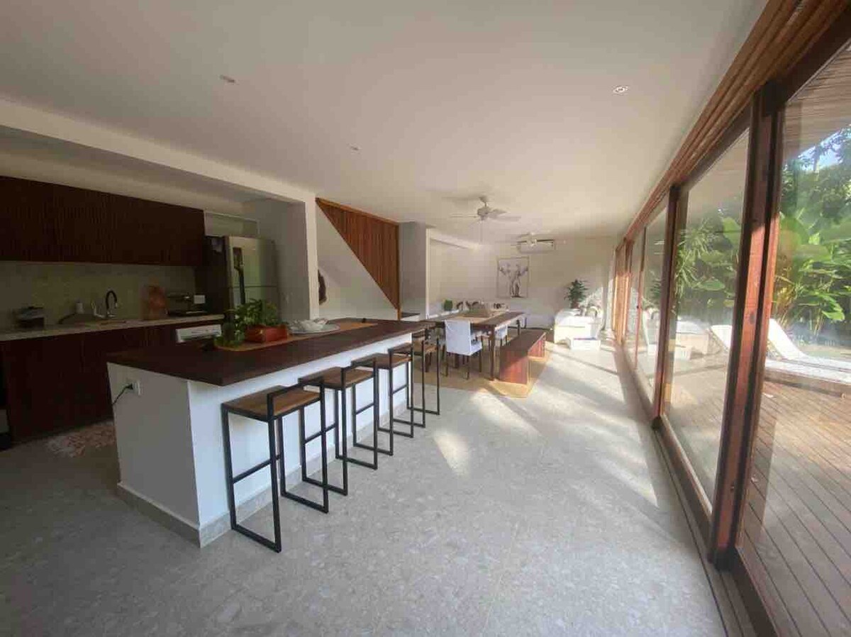 Sorprendente y tranquilo condominio frente al mar. Relájate junto a la piscina viendo increíbles colores al atardecer, solo vistos aquí. ¡Disfruta de hermosos paisajes del océano desde todas las habitaciones de la casa! Relájate en hamacas perezosas. Disfruta de una cocina de última generación, totalmente equipada, y haz una deliciosa barbacoa en la zona de barbacoa o hornea una pizza en el horno de ladrillo. Ya sea que busques reunir a familiares y amigos para un evento de toda la vida o relajarte en un paraíso tropical de escapada, aquí está el lugar.