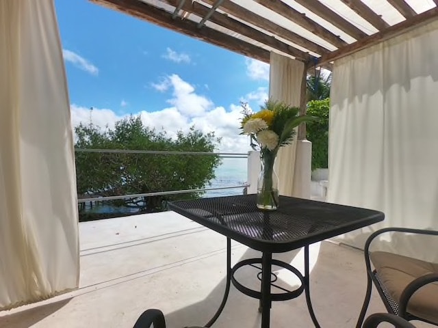 Villa romántica frente a la laguna azul de Bacalar. Ideal para parejas que buscan desconectarse, relajarse y disfrutar de la naturaleza con privacidad y confort. Cuenta con aire acondicionado, smart TV, wifi, jacuzzi, cama king size, cocina integral, nevera, baño privado con agua caliente, clóset, balcón, muelle privado, camastros y vista directa a la laguna. Incluye uso de kayaks, paddle board, visores, aletas y chalecos salvavidas. Desayunos, almuerzos y cenas disponibles con costo adicional