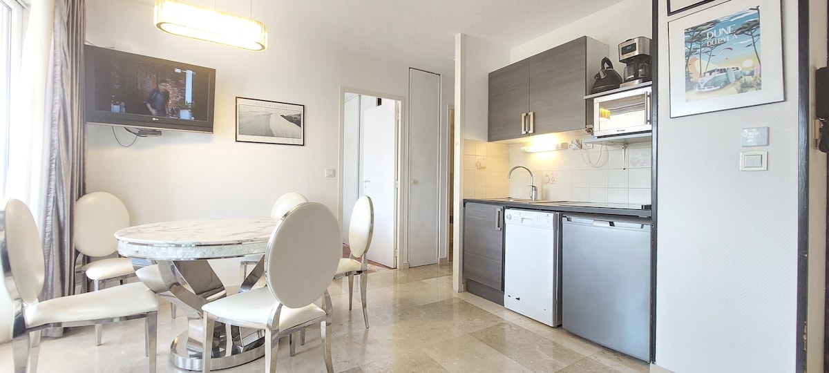 Nuestro estudio de 25 m2 situado en el corazón de Arcachon, ha sido cuidadosamente equipado para optimizar cada centímetro cuadrado. El interior está decorado con buen gusto, ofreciendo un ambiente moderno, luminoso y acogedor. Además de la cómoda cama, la cocina totalmente equipada y el moderno baño, también encontrará una zona de lectura donde podrá relajarse y sumergirse en un buen libro. Es el lugar ideal para descansar después de un día ajetreado explorando la zona.