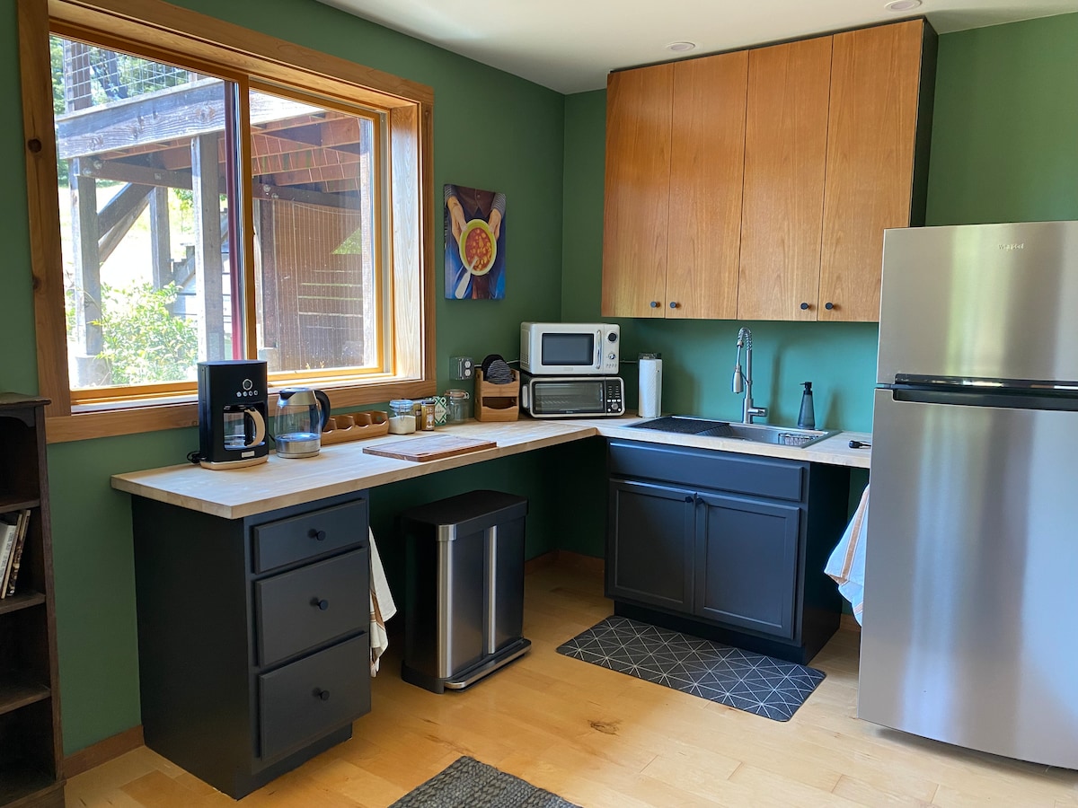 ¡Parada perfecta para los viajeros de la autopista 101! Barrio residencial más antiguo, semirrural, a menos de 3 millas de la ciudad de Ukiah y la autopista. Apartamento estudio (700 pies cuadrados) de una residencia de varias unidades. Acogedor estilo casita; entrada privada, estacionamiento privado designado (2), área de terraza privada Dormitorio (cama tamaño queen), sala de estar, mesa de cocina Cocina pequeña (sin horno ni estufa) adecuada para recalentar, preparar comidas ligeras y entregas. Mininevera, café, té, refrigerios Los huéspedes controlan la calefacción y el aire acondicionado Barrio apto para cannabis