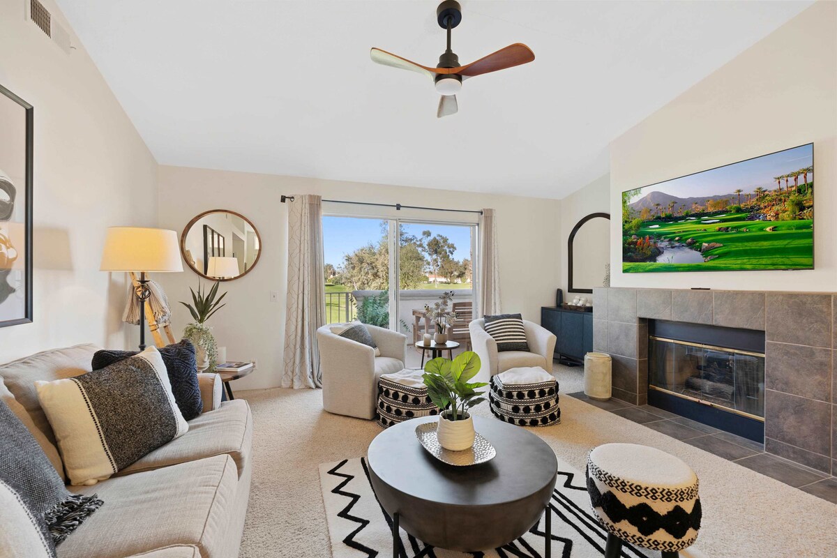 Apartamento Desert Falls, bellamente remodelado, orientado al sur, con vistas a una piscina cristalina y un gran cinturón verde. Las montañas del sur de Santa Rosa ofrecen un hermoso telón de fondo detrás de las abundantes palmeras. Diseñada pensando en las familias, esta casa recién renovada (cocina, encimera y suelos de madera) es la escapada familiar perfecta. Disfruta del sol todo el día desde el balcón trasero o relájate junto a una de las muchas piscinas. Los terrenos incluyen acceso a un gimnasio, piscinas, canchas de tenis e instalaciones de fitness.
