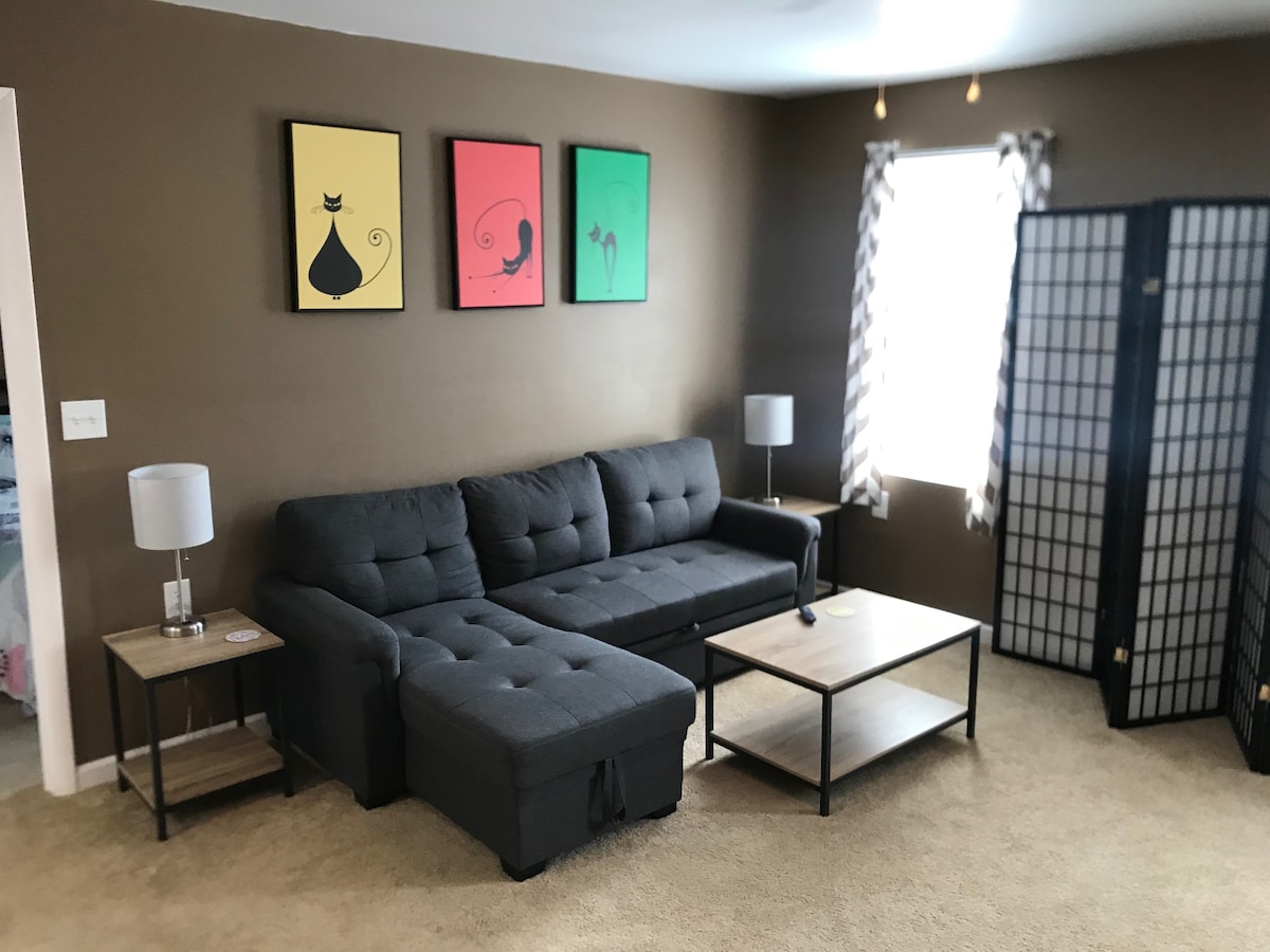 Relájate con toda la familia, acurrúcate con un amigo o disfruta de un tiempo a solas. Esta tranquila suite privada está llena de servicios que te encantarán. Aparcamiento gratuito las 24 horas, la cama tamaño king más cómoda de la historia :), sofá cama tamaño queen extraíble, wifi, TV ROKU de 48 pulgadas, Keurig, cocina completa, ollas, sartenes, cubiertos para 6..., lavavajillas, armario, cómoda, puertos USB en mesitas de noche, enorme ducha de lujo con luces RGB (puedes elegir el ambiente :), bidé con asientos térmicos, comedor con 4 sillas y mucho más