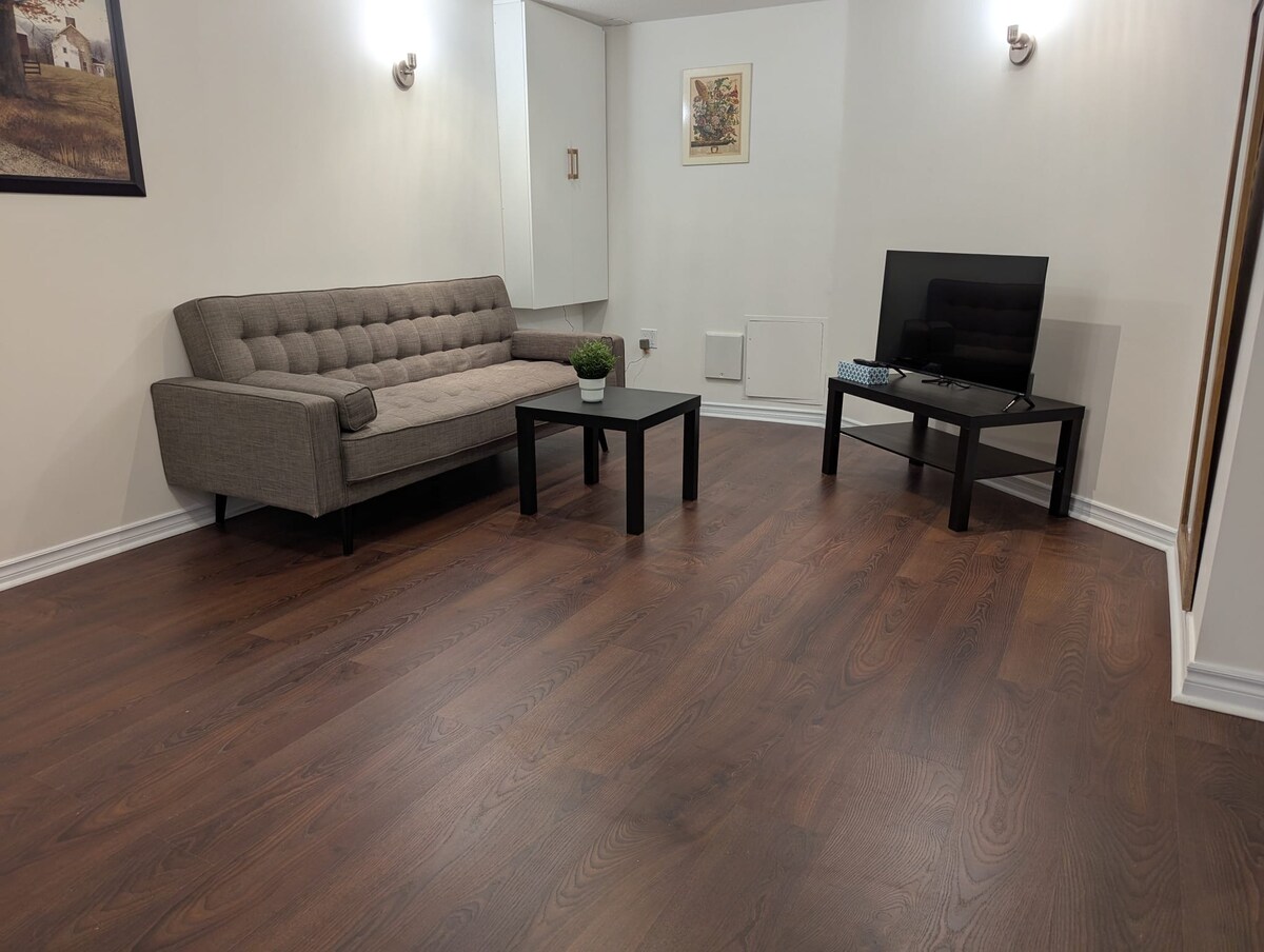 · Snowless Parking, 1 bed 1 bath, 1 living room, with full laundry and kitchen, refrigerator of course! and they are exclusively for your use! · Comfy environment with queen-size bed, cozy vibe, as well as keypad entrance to secure your safety. · Located in a quiet neighborhood. 1 minute to forest park and run field. · Provide 1 parking. 3 mins walk to bus stops. 10 mins drive to Highway 401. · Escape the busy and relax in this your premium highly privacy little basement apartment.