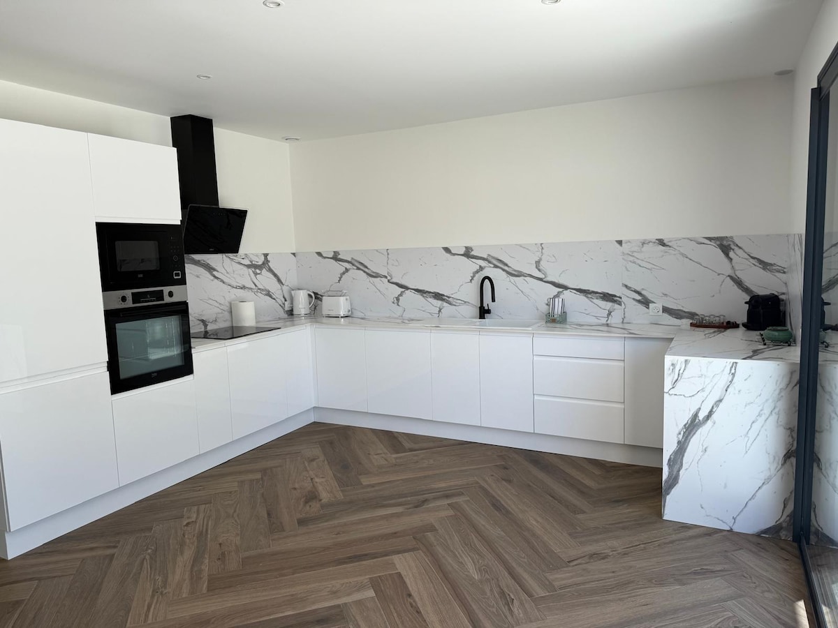 Casa nueva e independiente de 50 m², situada en un gran parque privado, arbolado y cerrado. Sala de estar con techo de catedral y vigas a la vista, jardín, terrazas, aire acondicionado, estacionamiento gratuito. Se admiten animales 🐾 Este alojamiento tranquilo ofrece una estancia relajante para toda la familia.
