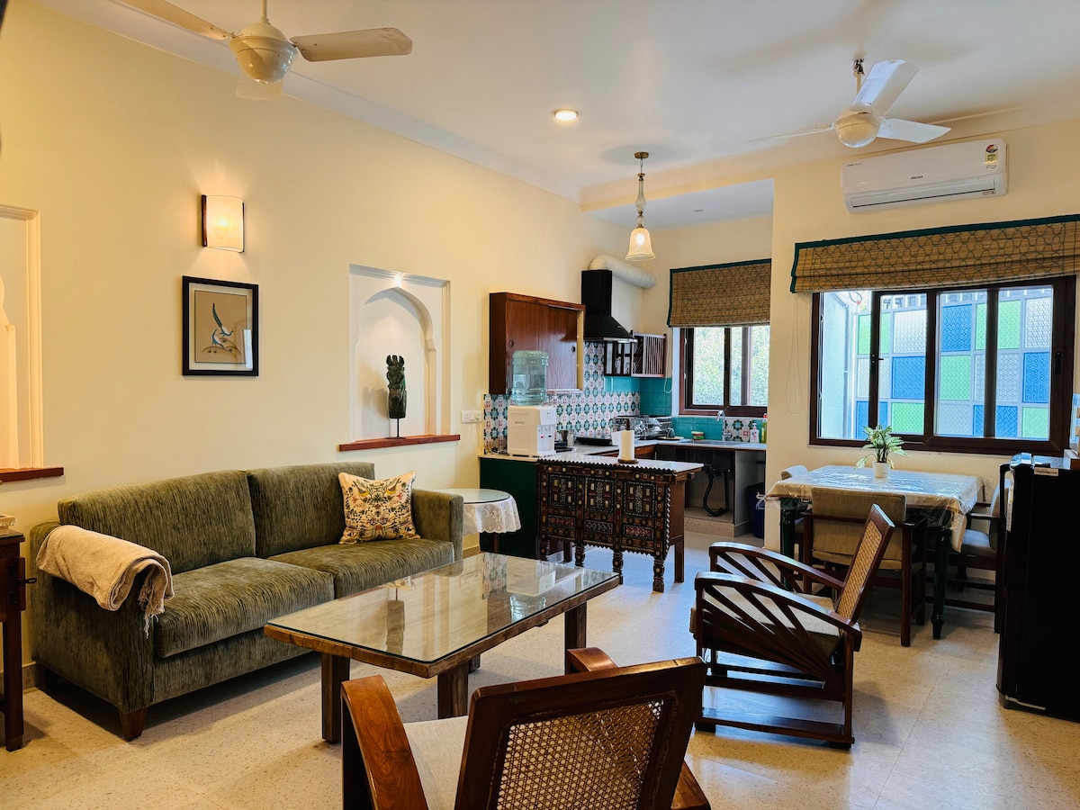 ¿Quieres relacionarte con familiares, amigos o compañeros de trabajo en plena naturaleza en Nueva Delhi? ¿Quieres experimentar la mezcla ideal de encanto y hospitalidad del viejo mundo con todas las comodidades modernas? ¿Deseas dar un paseo por los extensos jardines bajo los árboles frutales o esperar a ver pavos reales? Si la respuesta es SÍ, entonces este apartamento independiente de 3 dormitorios de la villa Shiv Niwas, con balcones privados y terraza en la azotea, cerraduras inteligentes, wifi de alta velocidad en toda la propiedad, aparcamiento gratuito y cuidadosas cocineras, ¡TE ESTÁ ESPERANDO!