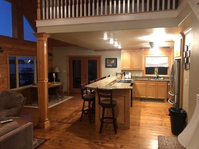 Esta casa es perfecta para una escapada familiar o una pequeña reunión de amigos. Tenemos una cocina abierta y un espacio para la sala de estar. 3 camas tamaño queen, un sofá cama tamaño queen y 3 literas para dormir cómodamente de 12 a 14. Hay un fogón situado a mitad de camino por la pasarela a un muelle cubierto muy grande que tiene un muelle flotante adjunto con escaleras en el agua. Shadows Landing tiene un lanzamiento de barco público a solo unos minutos por la carretera.