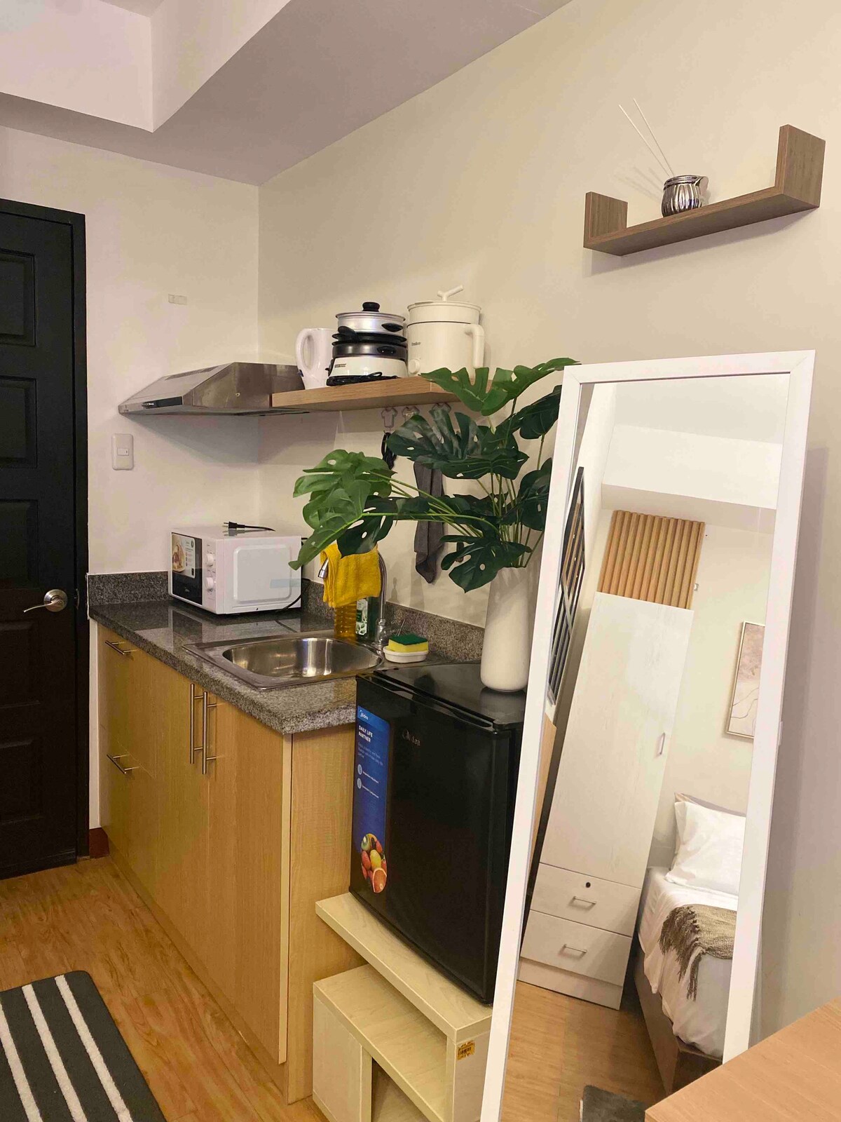 Moderno estudio amueblado en blanco con toques de negro y madera para la calidez; las plantas purificadoras de aire crean un espacio fresco y verde. Viene con internet de fibra de alta velocidad, Netflix y Disney+. Ofrece a los huéspedes la privacidad y la tranquilidad de un piso alto y una vista de la bahía y el horizonte de CDO. Ubicado en el centro de la ciudad, a pocos pasos del principal distrito comercial de la ciudad, con fácil acceso a centros comerciales, restaurantes locales populares, cafés y la ecléctica vida nocturna de la calle Corrales.