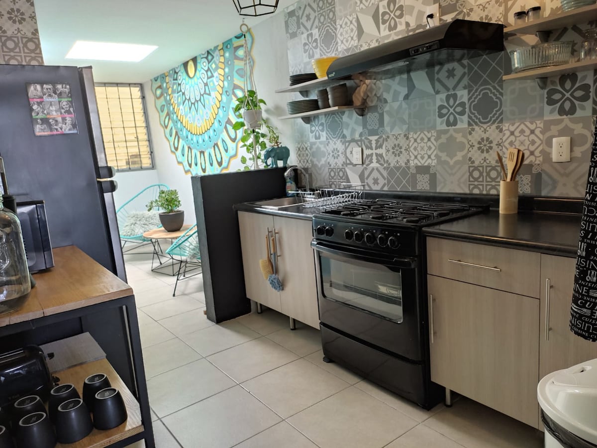 Magnífico Depa recién remodelado estilo Vintage Contemporáneo de 55m2 en 2 niveles. Ubicación céntrica, a 1km del Parque Alameda. En Planta Baja se encuentra la sala-comedor con cocineta (parrilla de inducción, microondas, refrigerador, cafetera y vajilla). En Planta Alta tiene Sala de TV con sofá cama tamaño matrimonial y una Recámara con cama King Size o 2 camas individuales con baño completo impecable. CAPACIDAD: 2 adultos 2 niños. ADULTO EXTRA $180 Check in 14:00 hrs Check out 10:00 hrs