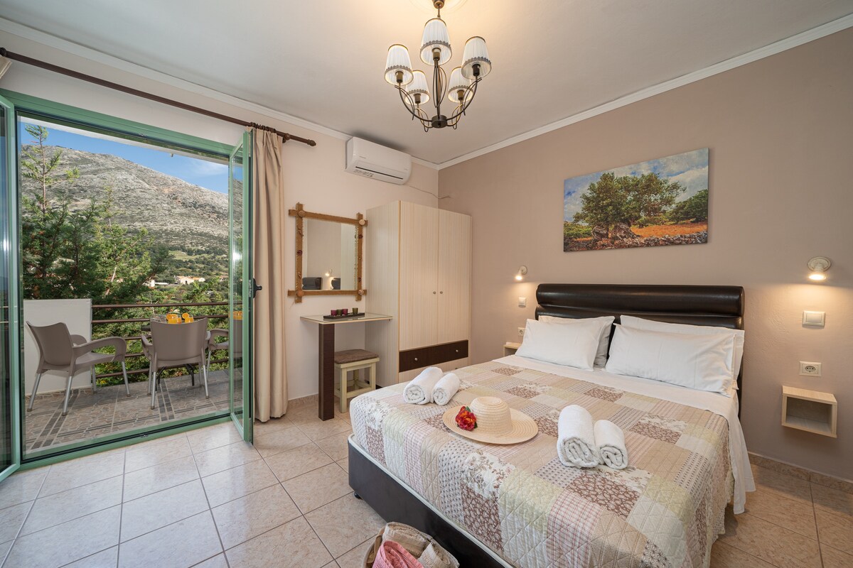 Mina’s apartments are located in the center of the island. The nearest beach, Myrtos, is on 1,5 km away from us. Myrtos is one of the most famous beaches in the world. The triple studio is located on the first floor and includes a double bed, a single, kitchen, bathroom, air conditioning and balcony.