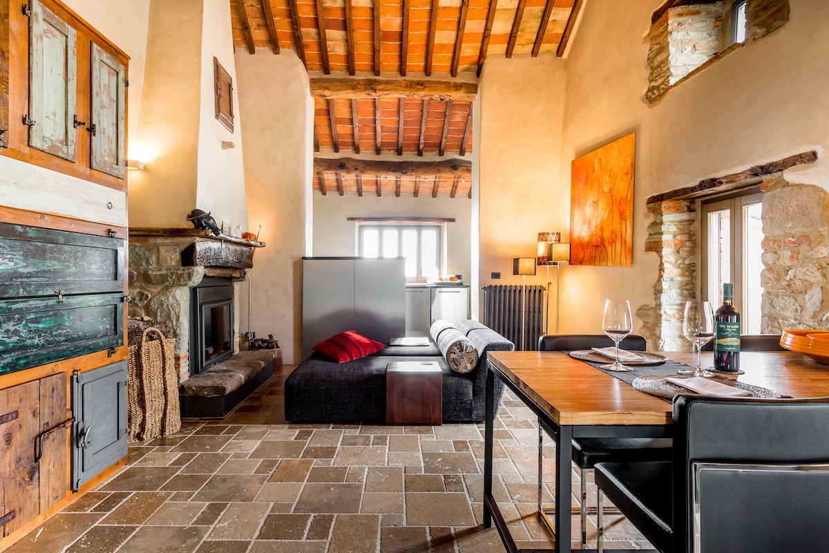 Bienvenido a Poggiodoro Loft, villa de piedras del siglo XVI ubicada en el campo de Anghiari. Impresionantes vistas, interiores encantadores y amueblados que ofrecen todo tipo de comodidades: una hermosa chimenea que mantendrá el ambiente cálido en invierno, la relajante sauna, el jardín privado donde puedes disfrutar del aire libre y el almuerzo bajo la pérgola, barbacoa, fantástica en las estaciones cálidas, salón con brasero, una piscina panorámica para pasar grandes momentos con amigos, para compartir con los huéspedes de la aldea.