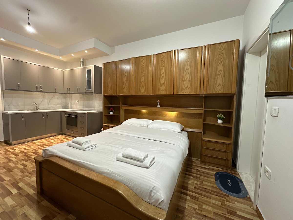 This cozy studio apartment in Myslym Shyri, Tirana, offers a prime location near Skënderbej Square and Blloku. The space features one multifunctional room with a comfortable bed, a small dining area, and a kitchenette equipped with essential appliances. The modern bathroom includes a shower and toilet. The apartment provides a perfect blend of comfort and convenience, ideal for exploring the city's cultural attractions and vibrant nightlife.