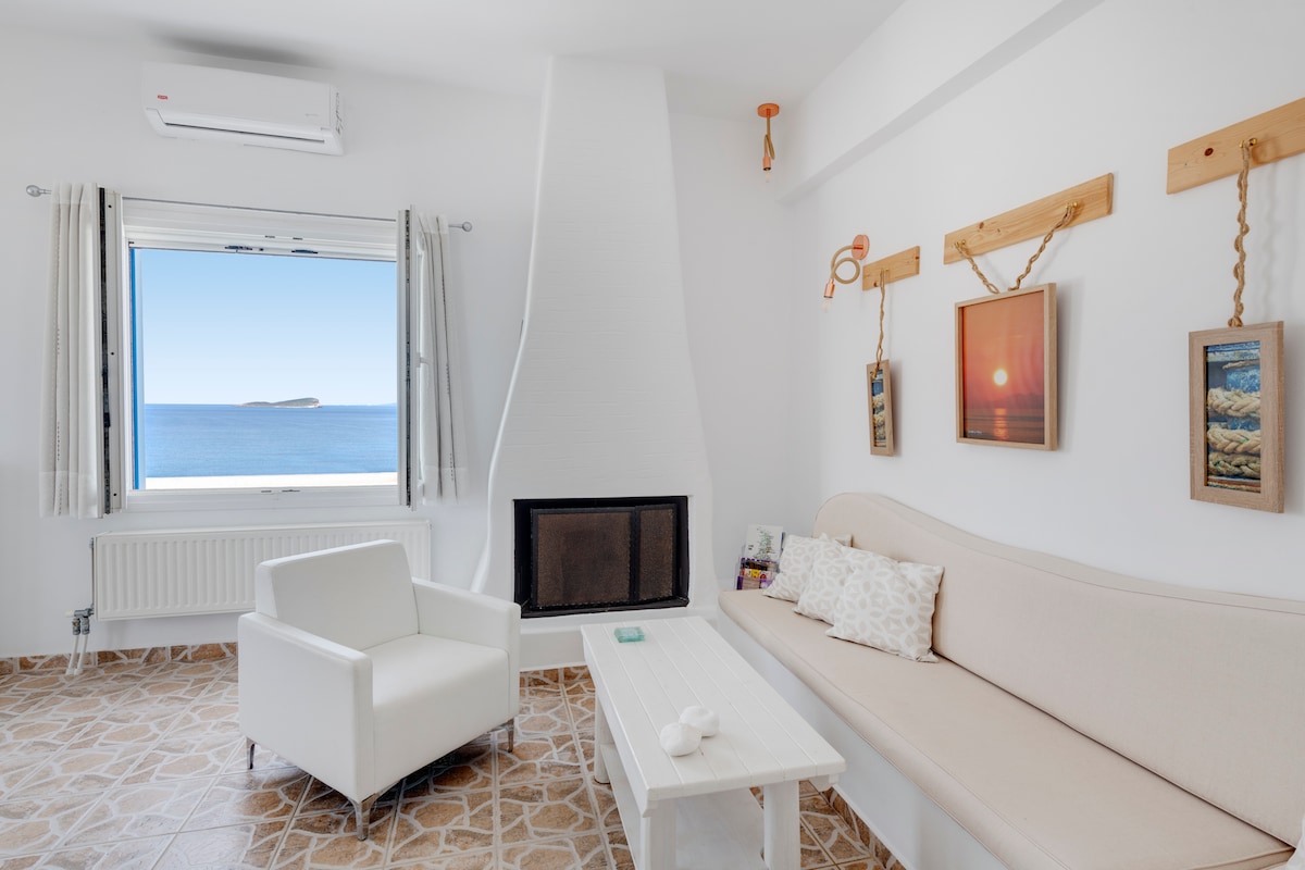 Aelion Sun is the ground floor apartment of Aelion Villas. It is a 90mm2, fully equipped apartment with unlimited view of the Aegean Sea capable of hosting up to sixr people. It has one bedroom with quin sized bed and one bedroom with two single beds, a large bathroom with shower, jacuzzi for for six people and a fully equipped kitchen. There are also sun beds for enjoying the view comfortably, washing machine, dish-washer, Wi-Fi, certified drinking water system, air conditioning and parking.