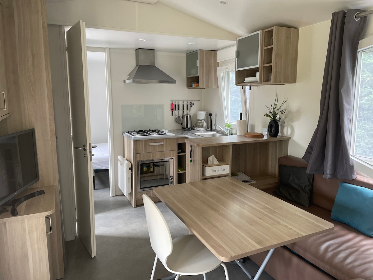 Bungalow de 25 m2 tout confort avec grande terrasse en bois de 25 m2 orientée plein sud Aucun vis à vis, au calme, dans un grand jardin clos et arboré et avec vue sur une piscine accessible de Mai à septembre ( non privative mais elle est grande, 6m X12m) 2 chambres avec lit 2 places ou 1 avec lit 2 places et l’autre avec 2 lits 1 place Pièce à vivre avec coin repas et banquettes, cuisine équipée 4 feux avec hotte, frigo avec congélateur, tv ... Salle d’eau avec douche et WC séparé