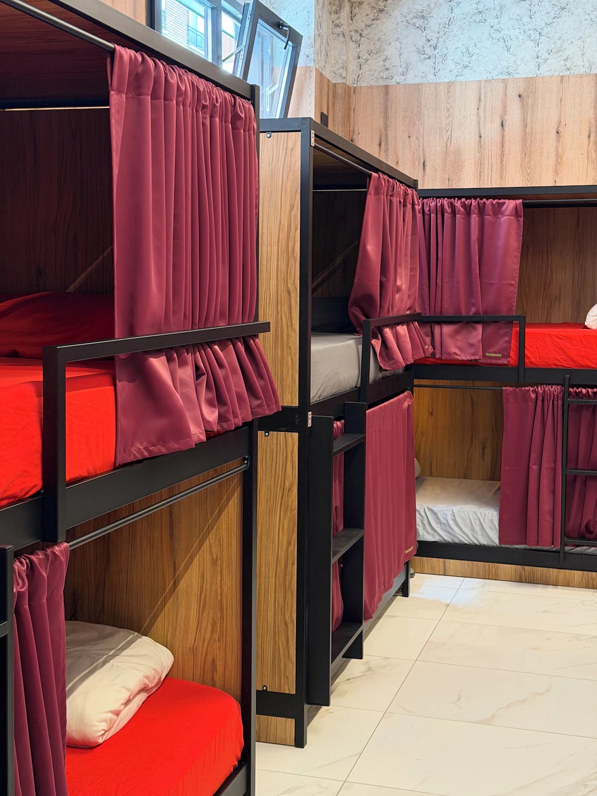 The Loft House Madrid Lavapiés Cama en dormitorio femenino con luz natural. Literas de 2m de largo. Cada cama tiene su luz personal, enchufe, usb y balda, cortina blackout para mayor privacidad y un amplio cajón individual que se puede cerrar con un candado que se puede alquilar en recepción. Disponen de: Aire acondicionado Calefacción WIFI de alta velocidad Baños y duchas compartidos en el pasillo Manta Sábanas Toallas (extra con suplemento y bajo petición)