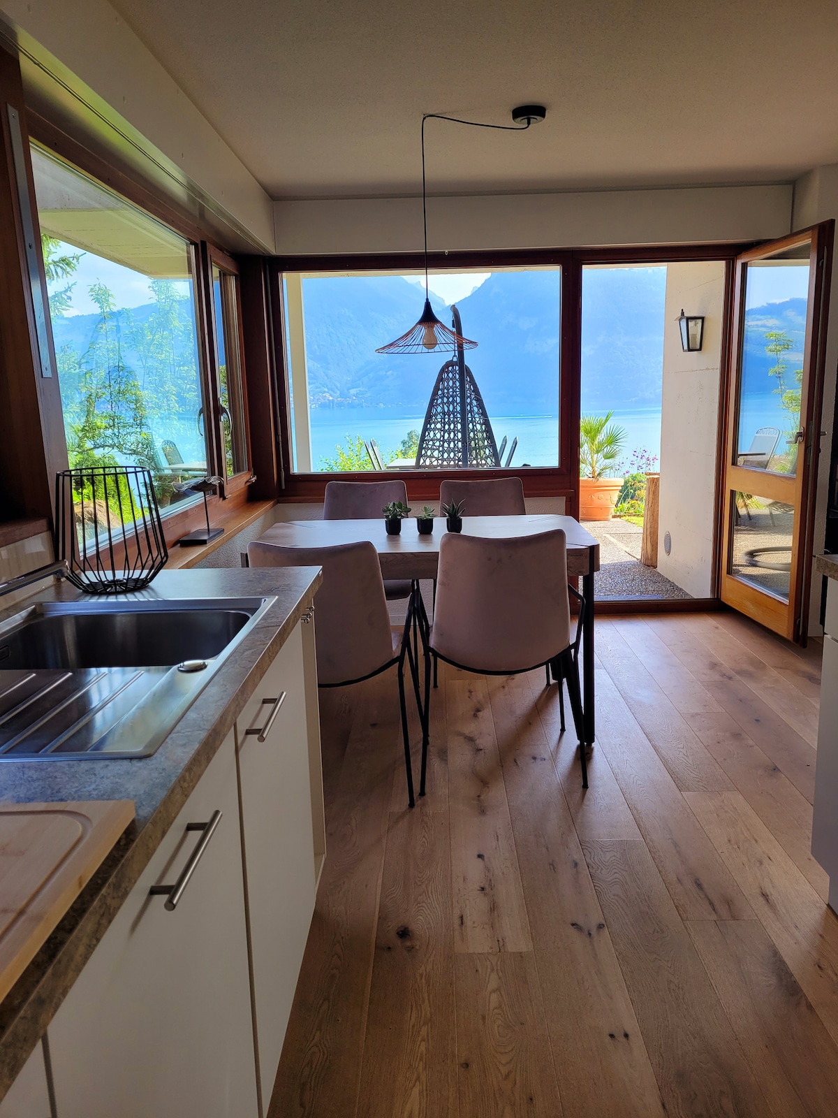 Joya galardonada en el lago de Thun. Casa galardonada con arquitectura recién construida en el lago. Experiencia en barco con vistas a las montañas boscosas de Niesen, Stockhorn, Eiger Munch y las montañas Jungfrau. Perfecto para una escapada romántica o para unas pequeñas vacaciones familiares. La sala de estar, balcón, cocina y baño se encuentran en la planta baja. 2 dormitorios se encuentran en el entresuelo. La terraza exterior está directamente sobre el agua orientada hacia el sur. A 15 minutos en coche de Thun.