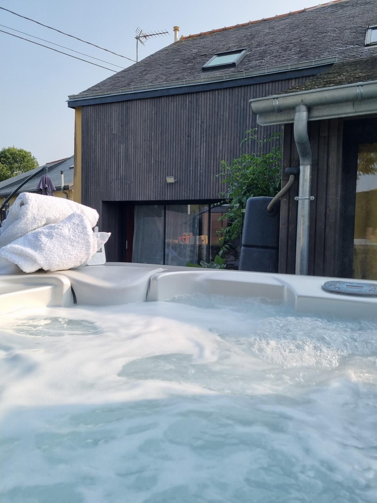 Alojamiento de gama alta con balneoterapia y sauna – Bruz, cerca de Rennes Disfrute de un paréntesis relajante en este magnífico alojamiento contemporáneo de 60 m² para dos personas Todo confort: • Cocina moderna totalmente equipada • Suite con cama King Size (180x200), ropa de cama de alta gama • Baño con bañera de hidromasaje, sauna y ducha a ras de suelo • Dos televisores conectados • Entrada con armario • Terraza y jardín Se proporciona toda la ropa de cama (toallas, albornoces ...)