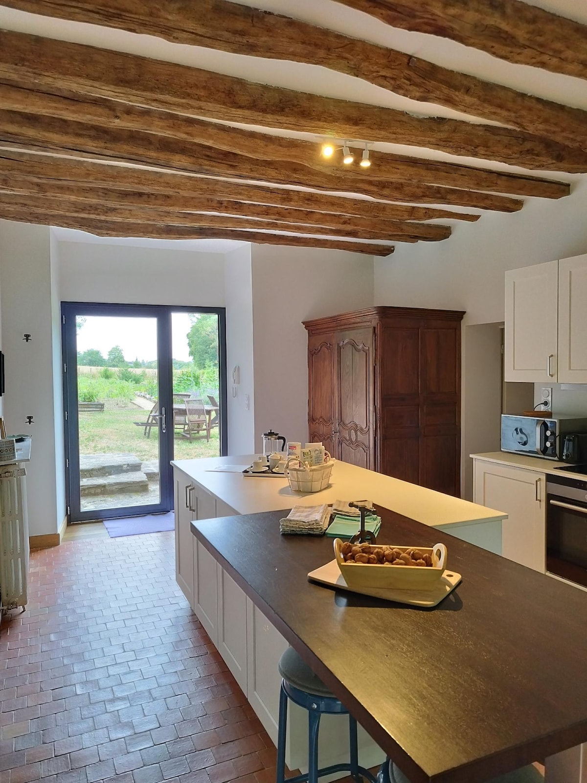 Casa antigua reformada, con 2 dormitorios y una gran sala de estar, lavavajillas, horno, microondas, hervidor, cafetera Tassimo, tostadora. Vistas al campo y a los caballos. Fibra de alta velocidad para teletrabajo. Para 1 persona o para 5 cómodamente, y un sofá cama para 2 . A menos de 5' del Parque Expo de Rennes, del aeropuerto, y a 10' de Rennes. A pocos minutos del Golf de Cicé Blossac o de St Jacques de La Lande. Entre Bruz y Goven. Acceso fácil y rápido por la 4 vías.