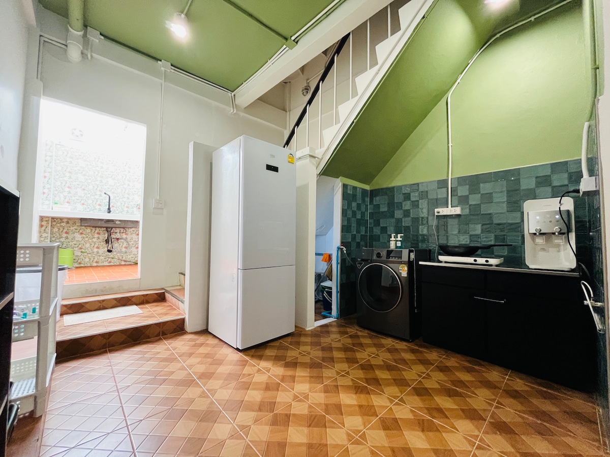 Disfruta de tu estancia en el centro de Bangkok en este acogedor y elegante lugar. Una casa de 160 metros cuadrados, recién renovada, que ofrece a grupos y familias un espacio agradable. Cuenta con todo lo necesario para que te sientas como en casa, incluyendo 1 cama tamaño queen, sala de estar (sofá cama), 2 baños, wifi, Netflix, lavadora y secadora, espacio de trabajo y una cocina bien equipada. A solo 5 minutos a pie de la estación de metro Ratchadaphisek. Fácil acceso a 7-11, bonitas cafeterías y mercados famosos como Jodd Fair, el mercado de Chatuchak, etc.