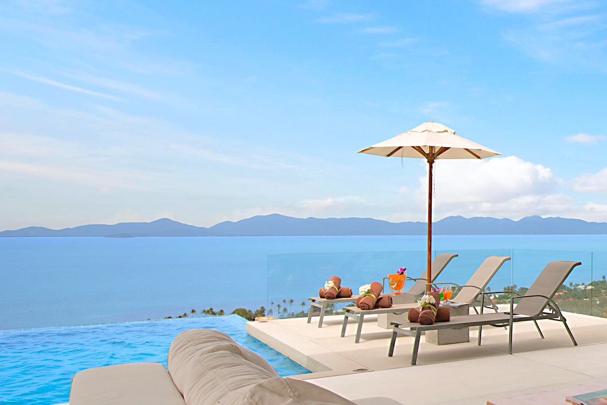 Villa privada de lujo de 620 m² con vistas al mar de 180° sobre las colinas de Chaweng → Desayuno y limpieza diarios. Piscina infinita de→ 25 metros de altura. → Gimnasio, billar, dardos y tenis de mesa → Hospitalidad con personal 24/7 en el lugar (inglés, tailandés) Bañera de hidromasaje de→ hormigón → Cada dormitorio con baño privado Internet → de alta velocidad y wifi → Televisión inteligente con Netflix Sistema de sonido→ Bose → Café y agua potable gratis → Agua y electricidad incluidas → 10 millones en auto a las playas → Más servicios disponibles bajo petición