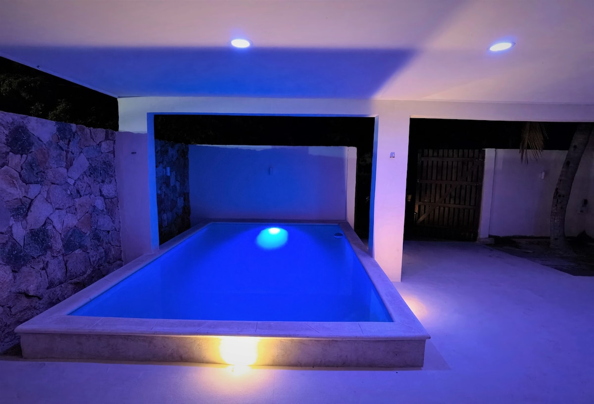 Disfruta con tu familia o pareja este alojamiento con toques de vintage y rústico, fresca, con espacios abiertos y la naturaleza alrededor, vivirás la experiencia de estar en la playa. Equipado con todas lo necesario para pasar una estancia cómoda y relajada, ven a nadar en las playas color esmeralda y el sol radiante acompañado de tus bebidas refrescantes, disfruta tus noches en la piscina con iluminación, o relajate en la terraza con un buen café. Una estancia para disfrutar y recordar.