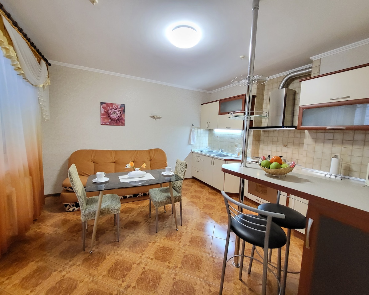 Apartamento en un edificio de clase ejecutiva. Renovación elegante en colores claros. Equipado con todos los electrodomésticos necesarios para una cómoda Ideal tanto para viajes de placer como de negocios. La casa cuenta con tres restaurantes (cocina europea, italiana y mediterránea); un gimnasio; aparcamiento seguro. Un gran supermercado Novus está a 2 minutos caminando de la casa. El centro comercial Komod se encuentra a 5 minutos a pie, que cuenta con un moderno cine Multiplex. El Centro Internacional de Exposiciones está a doscientos metros.