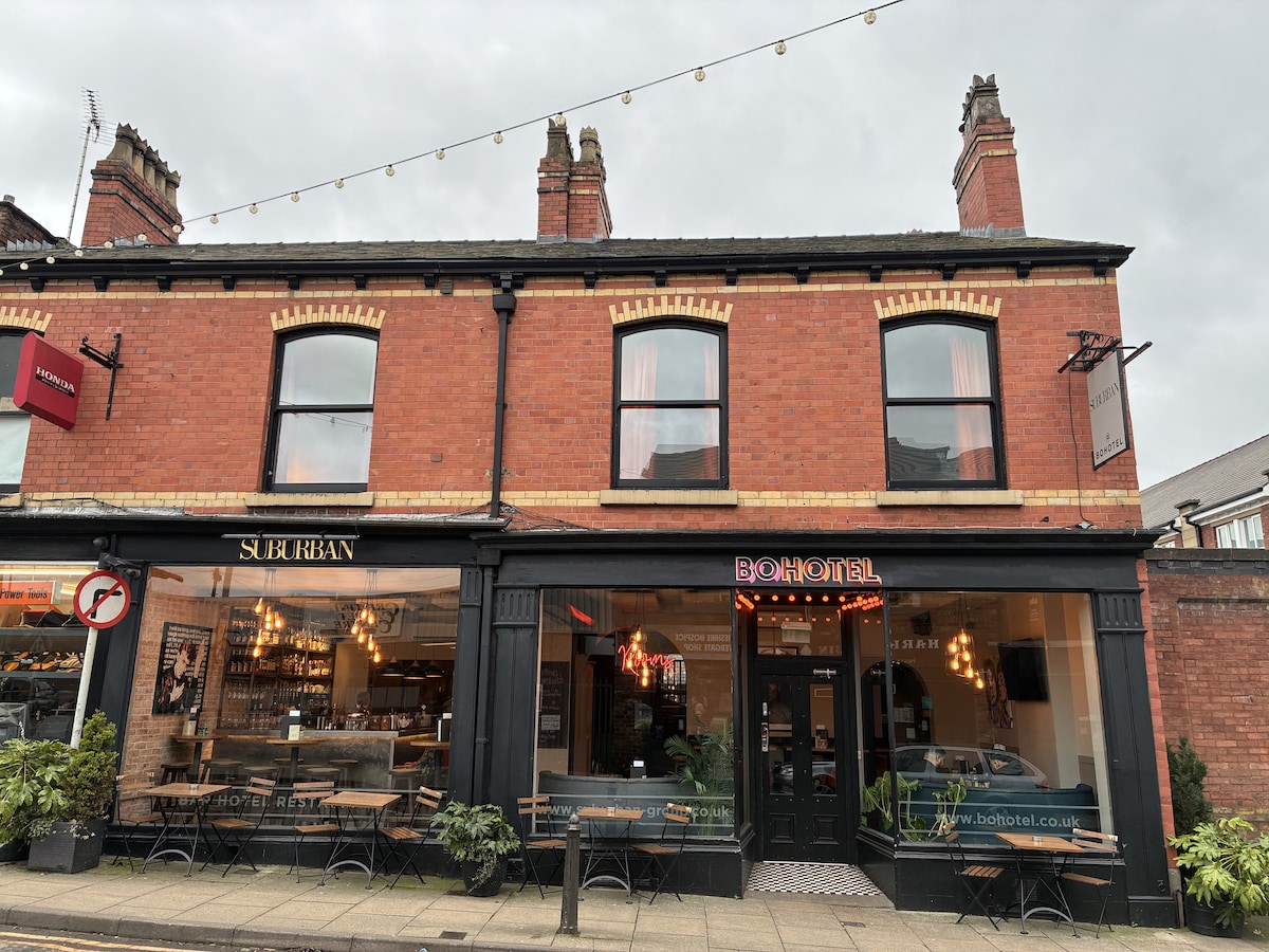 Grab yourself a comfy bed in our mini hostel at BOHOTEL Macclesfield. The dorm sleeps 4 in two bunk beds with comfy mattresses, fresh bedding and a goody basket with sweets and towels and a tea tray. The ensuite allows you to get cleaned up before going out to explore the town. The restaurant and bar is open to everyone and guests get free hot drinks when ordering breakfast. We always price at below £35/night to make sure this is the most affordable hotel stay in Macc!