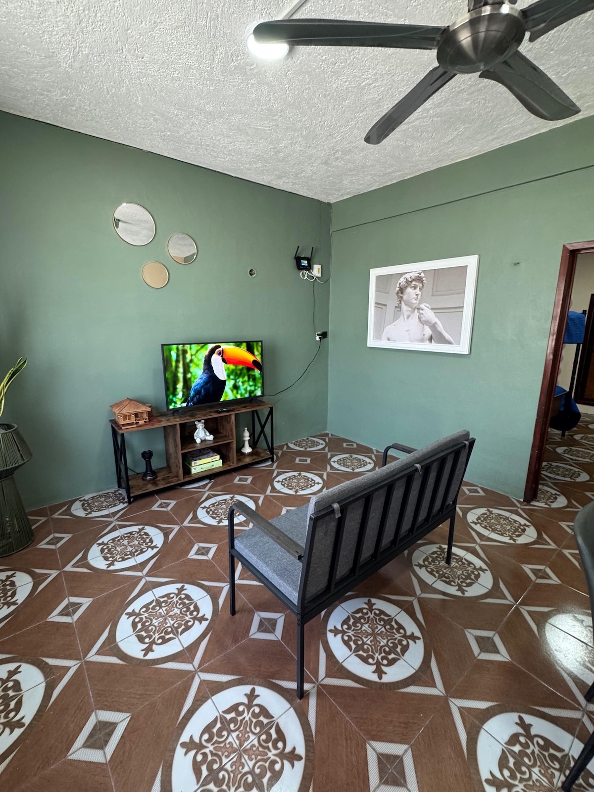 Casa con dos recamaras, sala amplia, comedor, cocina, baño, balcón y área de lavado con terraza, cuenta con tv Smart en cada habitación y sala, internet en toda la casa de alta velocidad, cuenta con aire acondicionado y ventiladores en cada recámara y ventiladores en sala y comedor La cocina cuenta con refrigerador, horno de microondas, estufa integral y todo lo necesario como utensilios de cocina.