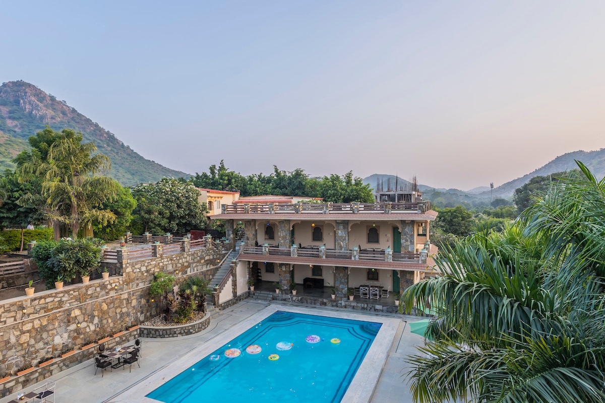 Jungle-themed Bagh Haveli :Pool swing & Hill View