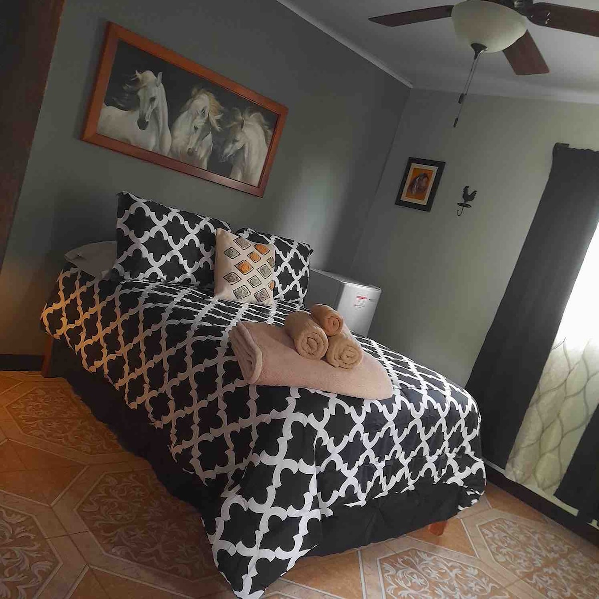 Elegante habitación que cuenta con estacionamiento bajo techo, entrada independiente, cama Queen size, almohadas, sabanas, mesitas de noche, área de trabajo, tomacorrientes, wifi Starlink, smart tv 50" (Netflix y Youtube), mini refrigerador, closet, gavetas, cortina blackout, abanico recargable, baño privado, agua caliente, toallas, jabón de cuerpo/manos, basureros y papel higiénico.
