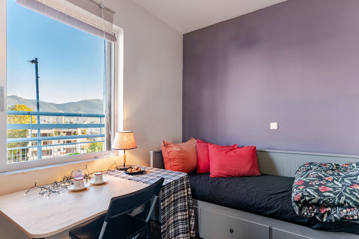 Esta habitación reformada es completamente privada, con su propia entrada, balcón y baño. Está equipada con una cómoda cama individual (toallas y ropa de cama incluidas), un gran escritorio, una mininevera, aire acondicionado y un espacioso armario para todas tus cosas. El barrio es muy seguro y tranquilo, con tiendas que pueden proporcionarte casi cualquier cosa, pero a poca distancia a pie de todos los sitios principales y del bullicio de la ciudad. La estación de metro/autobús más cercana es EVANGELISMOS, que está a menos de 10 minutos a pie.